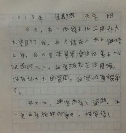 當(dāng)年8月份,紀(jì)某某和賈某某兩位學(xué)生分別以優(yōu)異的成績考入石家莊鐵道學(xué)院和河北工程技術(shù)學(xué)院。因家庭收入過低,無法支付昂貴的學(xué)費(fèi),家人一籌莫展,得知情況后,孫文董事長慷慨解囊,分別給予紀(jì)某某10000元、賈某某6000元的資助。受助家長激動地說,真不知道怎么感謝董事長的恩情,兩位學(xué)生表示,一定不辜負(fù)孫文董事長的愛心和厚望,努力學(xué)習(xí),用優(yōu)異的成績回報(bào)社會。
