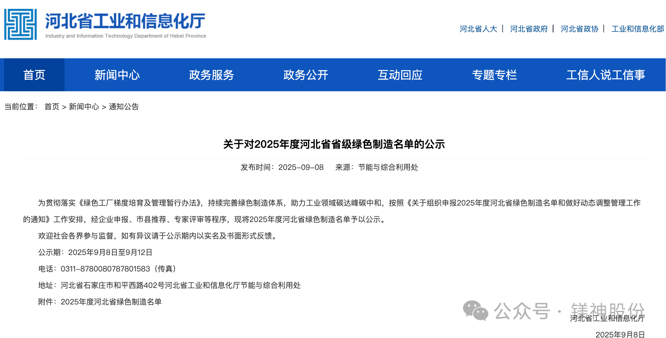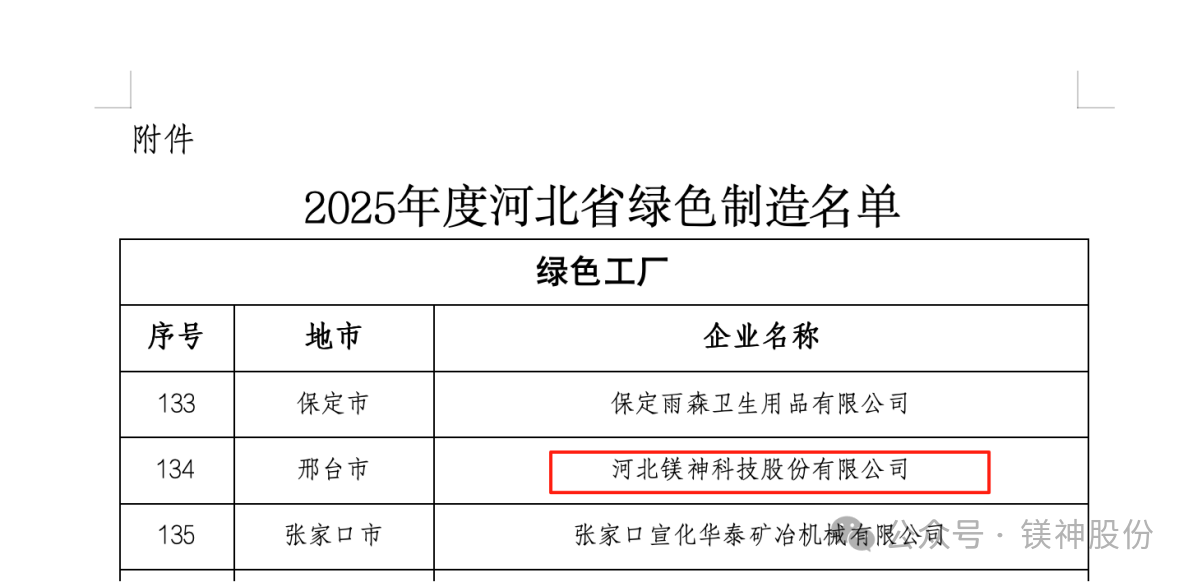 2025年9月8日,河北省工業(yè)和信息化廳正式公布了2025年河北省綠色制造名單。河北鎂神科技股份有限公司(以下簡稱“鎂神科技”)憑借在綠色制造、節(jié)能降耗、清潔生產等方面的突出表現,成功入選“2025年度河北省綠色制造名單”!這是公司積極踐行綠色發(fā)展理念、扎實推進綠色體系建設取得的重大成果,也是對鎂神科技綠色制造水平和可持續(xù)發(fā)展能力的認可!
